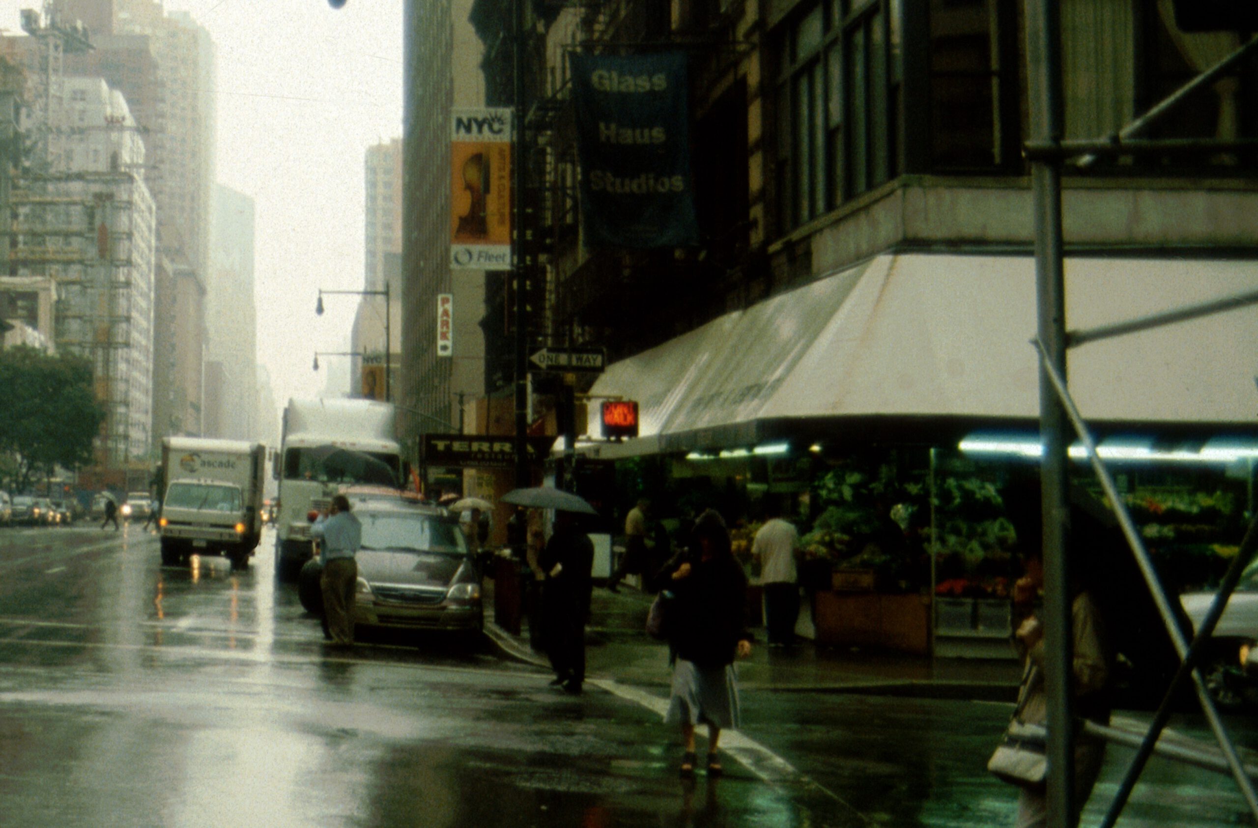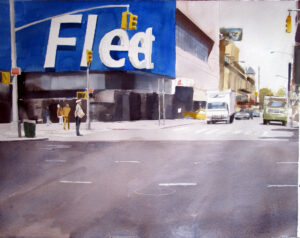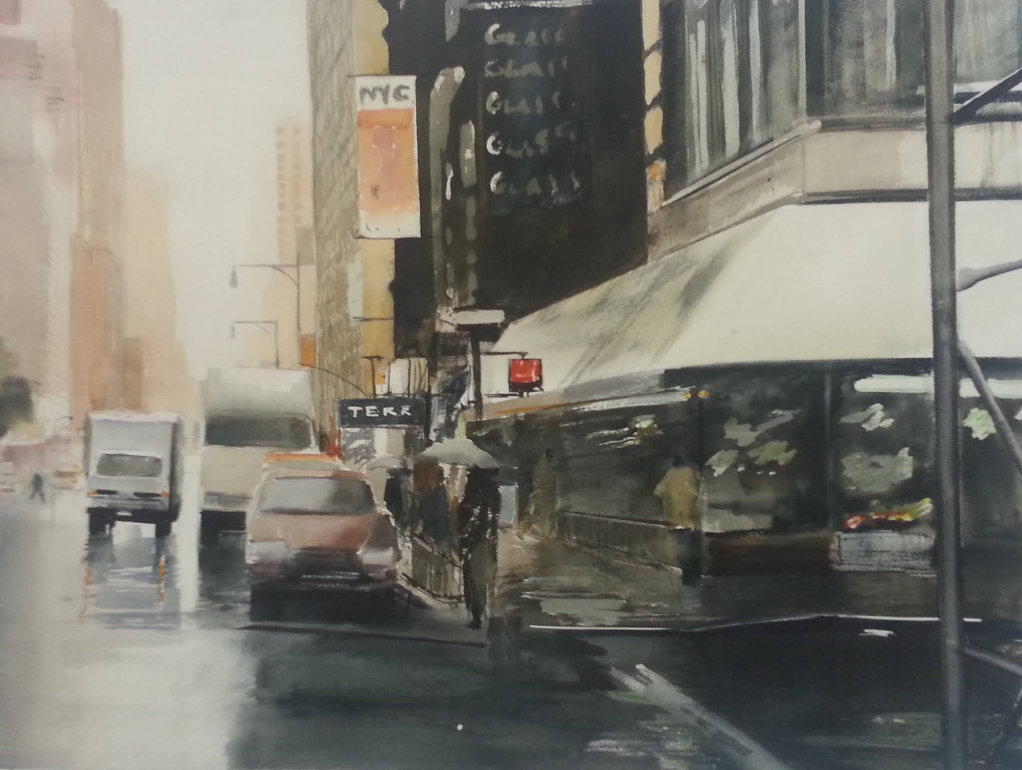 En este segundo ejemplo de una acuarela de 110 x 89 cm de NY pueden encontrar los mismos tres elementos que componen la luz en los días soleados sin problema (el taxi que entra en el garaje, la luz azul de las cabinas de los camiones, la sombra violeta de la carretera y el color sol de las personas iluminadas directamente)