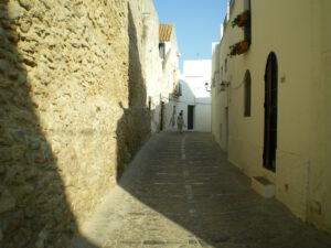 En este trabajo mio sobre Vejer de la Frontera, un pueblo gaditano de ensueño…represento los tres amigos de un dia soleado: la luz del sol (en el fondo y la pared lateral izuquierda), el cielo azul (en la extraña luz de la derecha y la sombra violeta) y el reflejo (que se aprecia en la pared de la derecha, donde vibran unos naranjas debajo de los violetas velados de la sombra)
